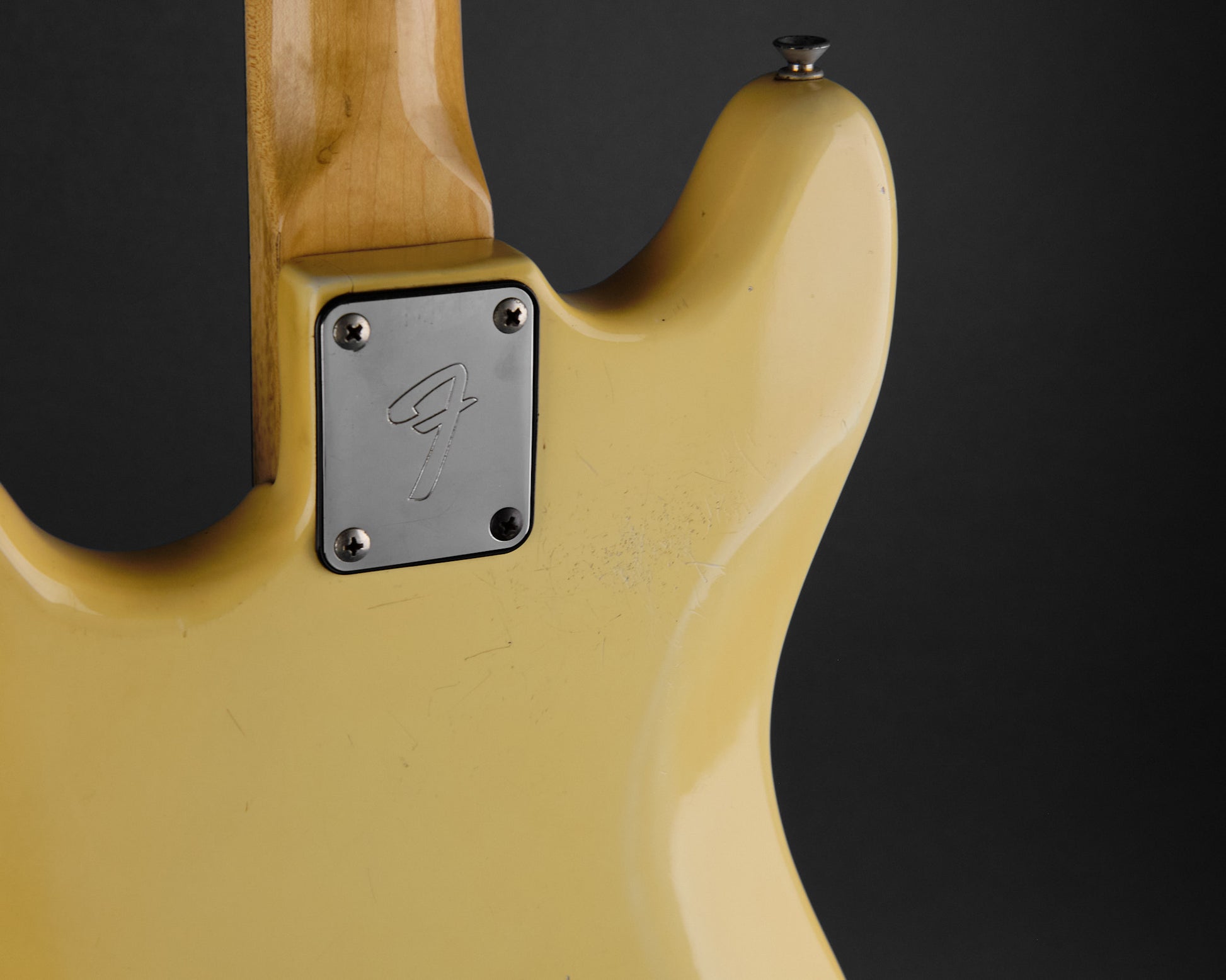 The original finish has now yellowed and has taken on an almost banana like tone. The frets appear original as does the wiring, pickups, and pots. Some foam has been added in one of the cavities as well as a screw added into the tremolo system, but besides that this is a great example with plenty of mojo and character.